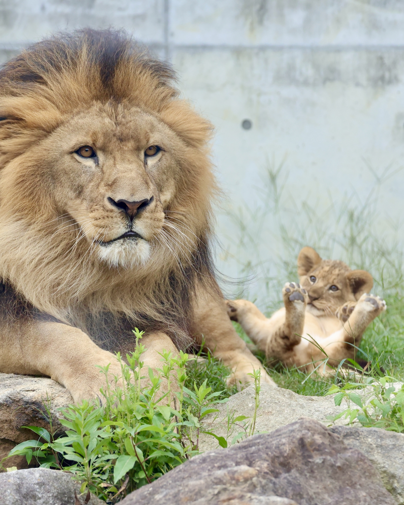 父アースの背中に乗ろうとするも失敗に終わる仔ライオン