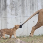 アースパパのシッポを追いかけて遊んでる姿はとても愛らしいです。アースパパも怒らずにそのまま引っ張っていて寛大なパパだと感動しました!