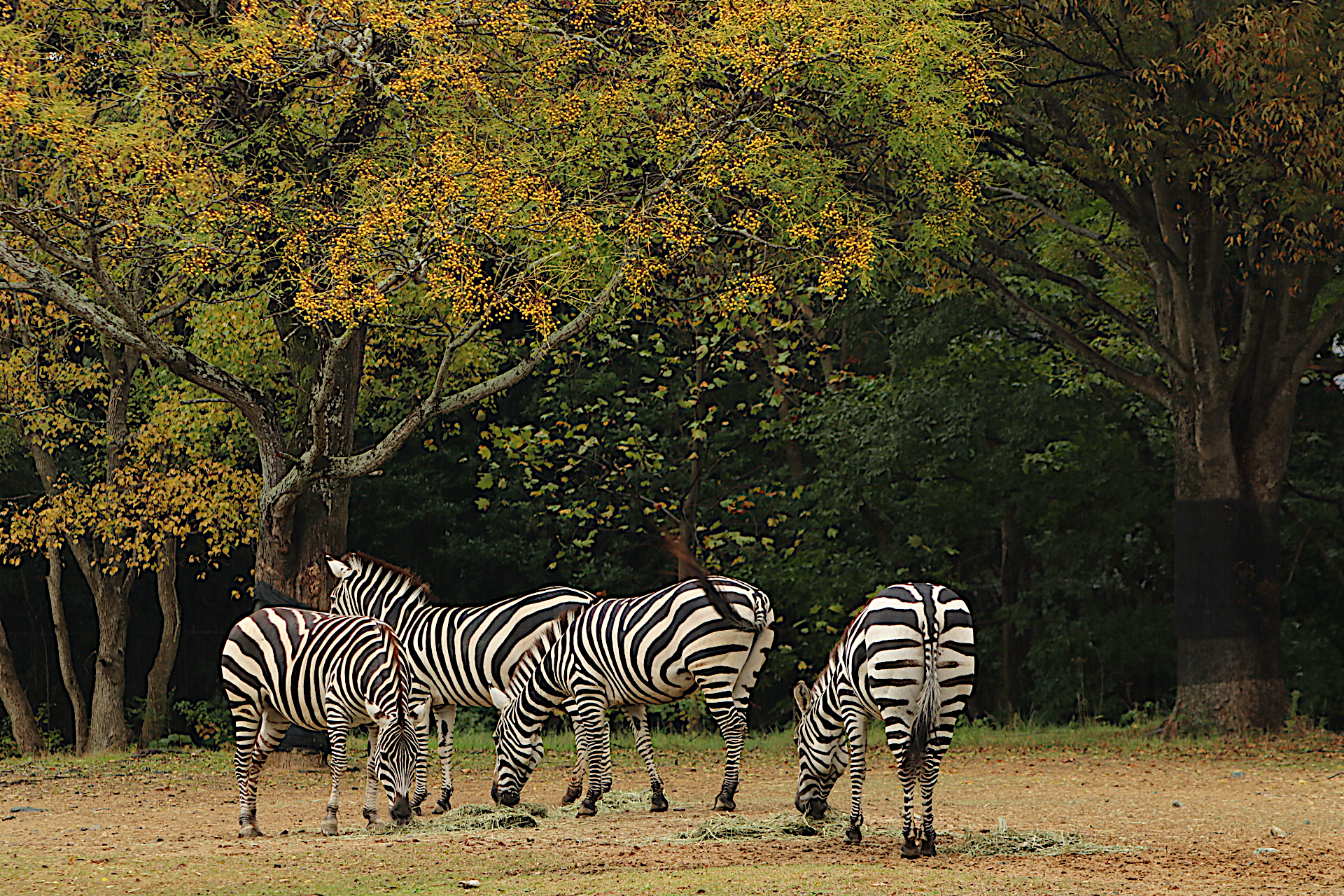 秋色の樹木を背景に朝のもぐもぐタイムのシマウマさん達です。