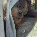 大きな毛布をすっぽり被って、暖かい岩の上に乗って、完全防備なウータン。イケメンの視線をいただきました!