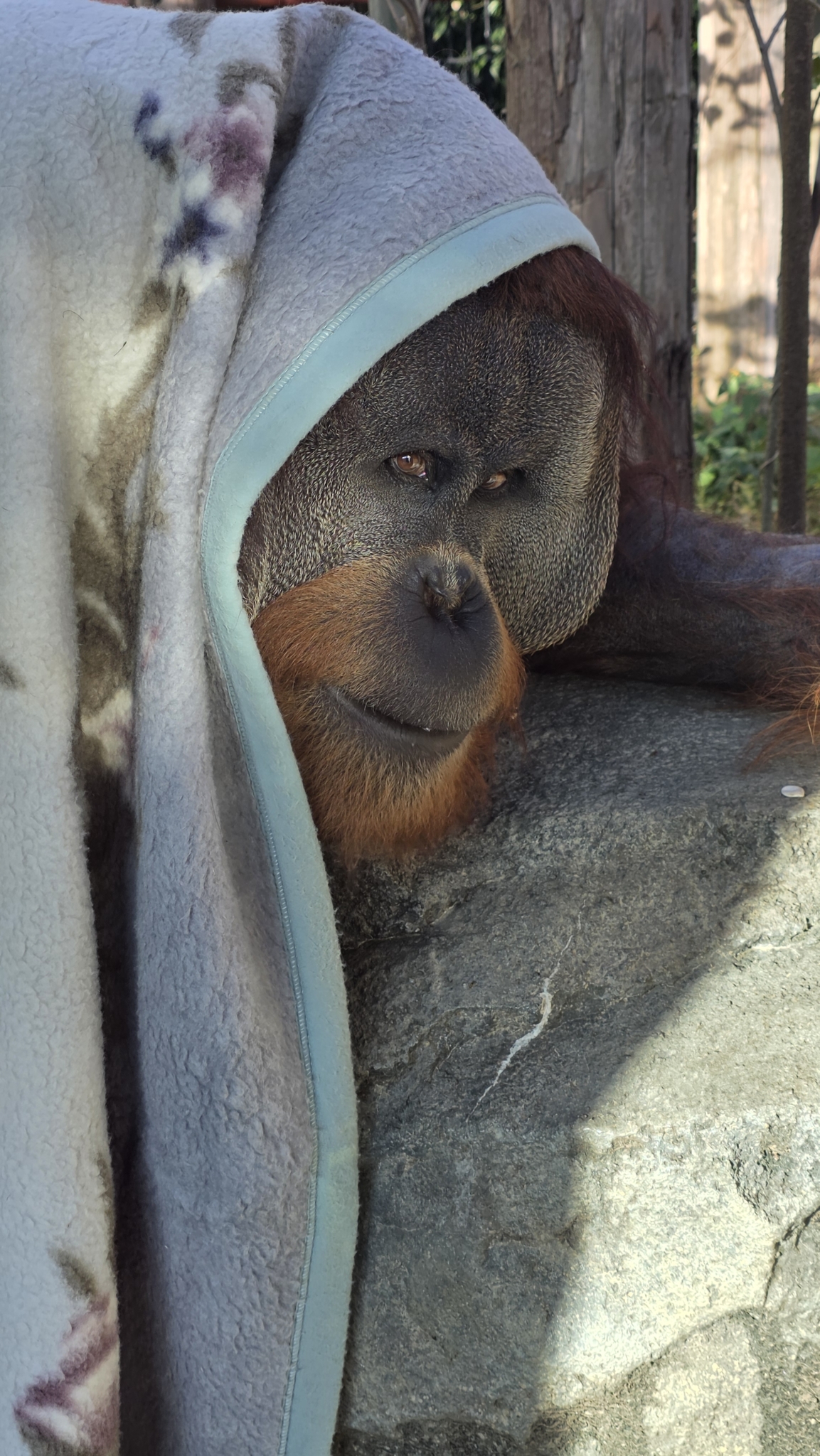 大きな毛布をすっぽり被って、暖かい岩の上に乗って、完全防備なウータン。イケメンの視線をいただきました!