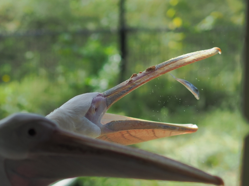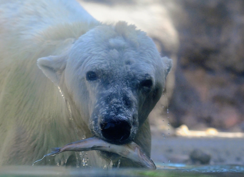 もぐもぐタイム時にクッキーは大きな魚(ホッケ)をゲットしたら水から上がって外で食べます
