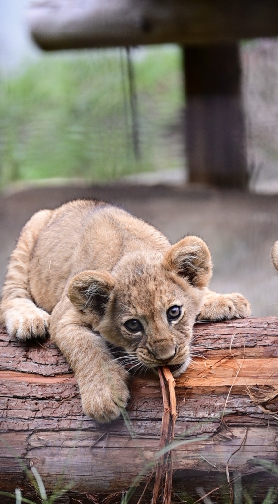 ライオンの赤ちゃんが無邪気に木を齧っていました。