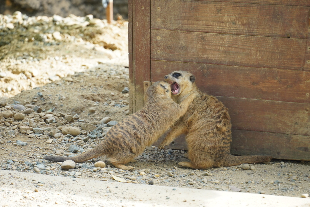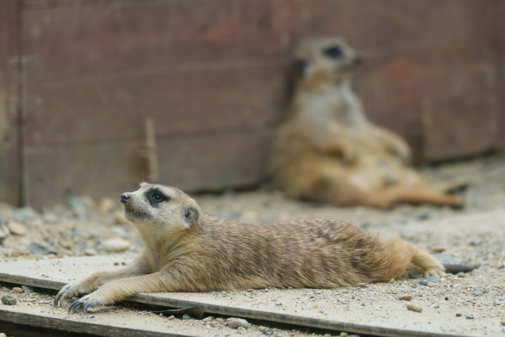 手前のミーアキャットと奥のミーアキャットのゆったりした雰囲気で、「今日のごはん何かな〜?」「何だろね〜?」とのほほんとした会話がされてそうでお気に入りの1枚です