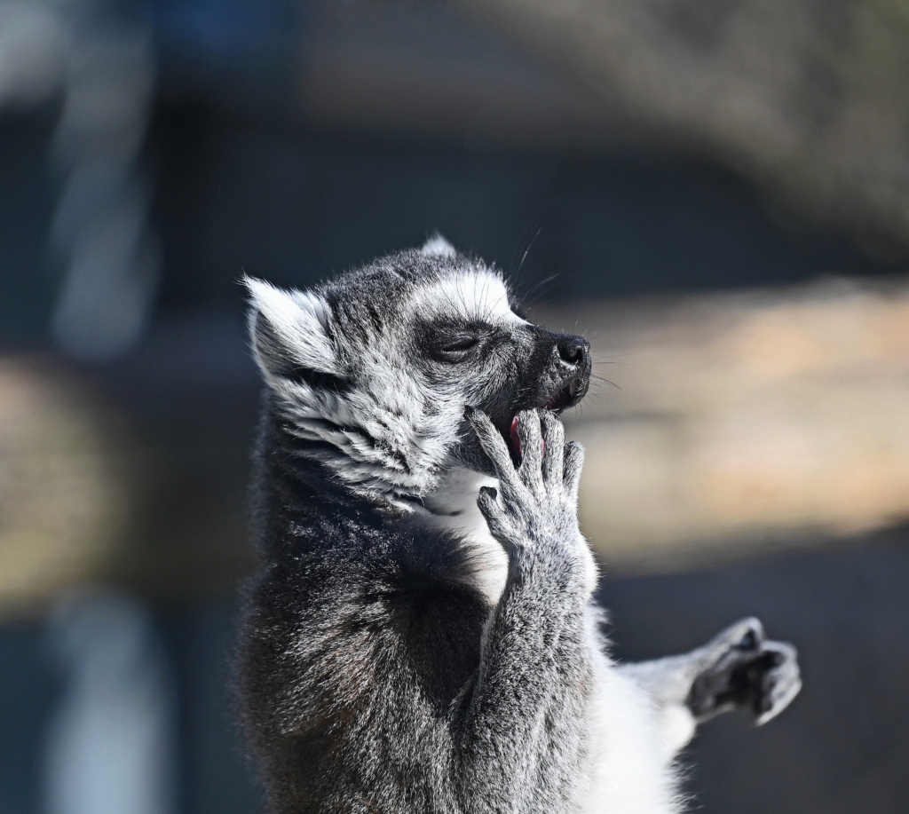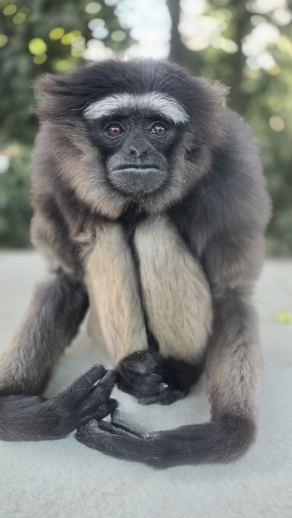 大きな毛布をすっぽり被って、暖かい岩の上に乗って、完全防備なウータン。イケメンの視線をいただきました!