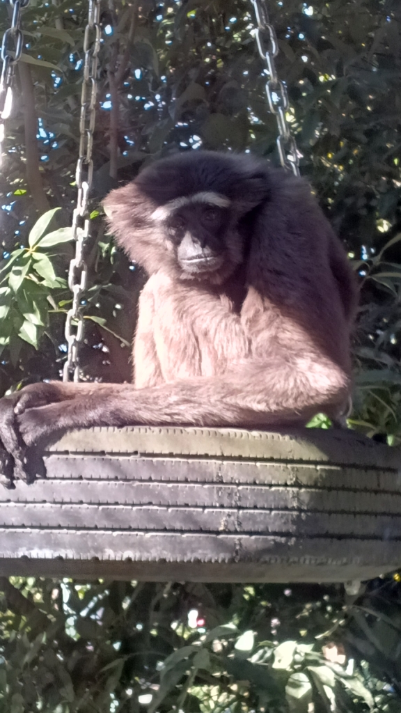 フィーダーの中のピーナッツを取り出すための枝を吟味中のウータンくん。このあと小枝を取り払った木を使ってピーナッツゲット。賢いね