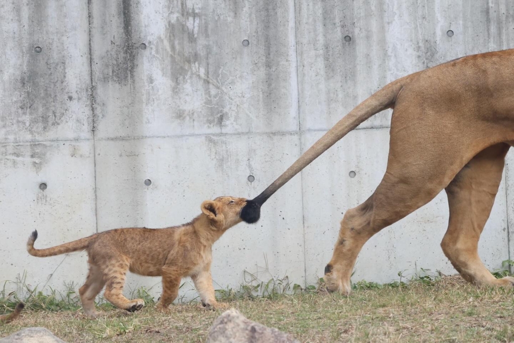 アースパパのシッポを追いかけて遊んでる姿はとても愛らしいです。アースパパも怒らずにそのまま引っ張っていて寛大なパパだと感動しました!