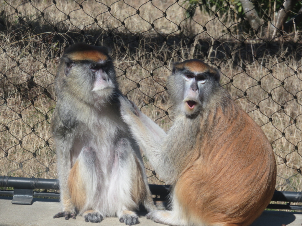 パタスザルが姿勢よく座っている写真を撮影しました。まるで椅子に座っている人間のようです。