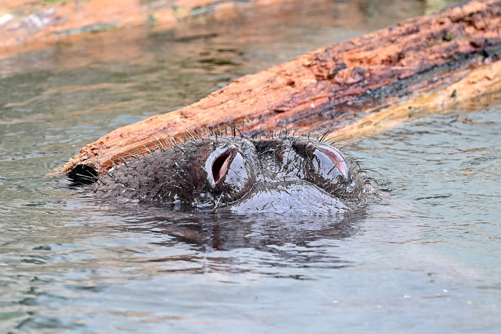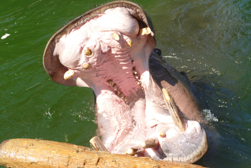 出目吉くんが大きな口を開けて丸太遊びをしていました。