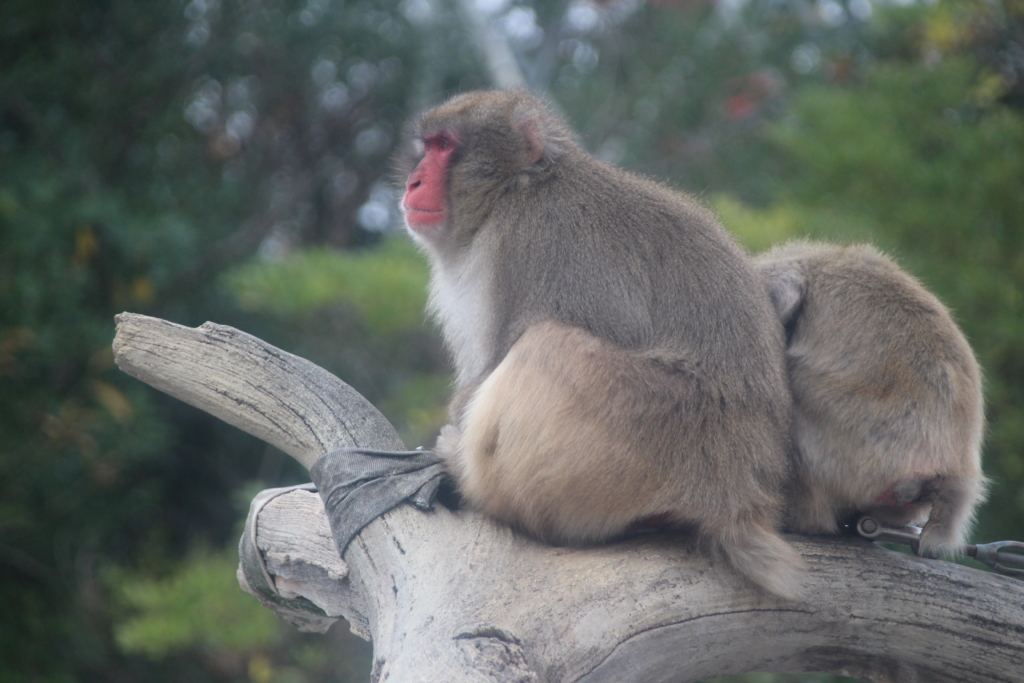 曇り空の寒い中、寄り添うお猿さんです