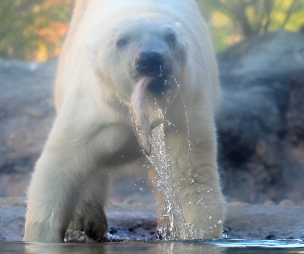 もぐもぐタイム時にクッキーは大きな魚(ホッケ)をゲットしたら水から上がって外で食べます
