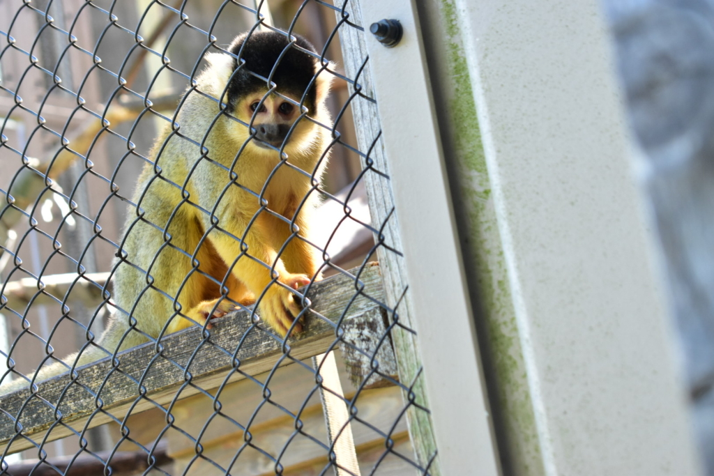 リスザルがおうちから手を出してネジをさわっていました。おうちから出て、僕と遊びたそうでした。