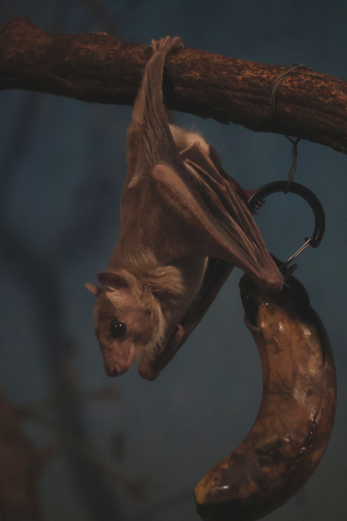 大きなバナナに1匹でかぶりつくエジプトルーセットオオコウモリ
