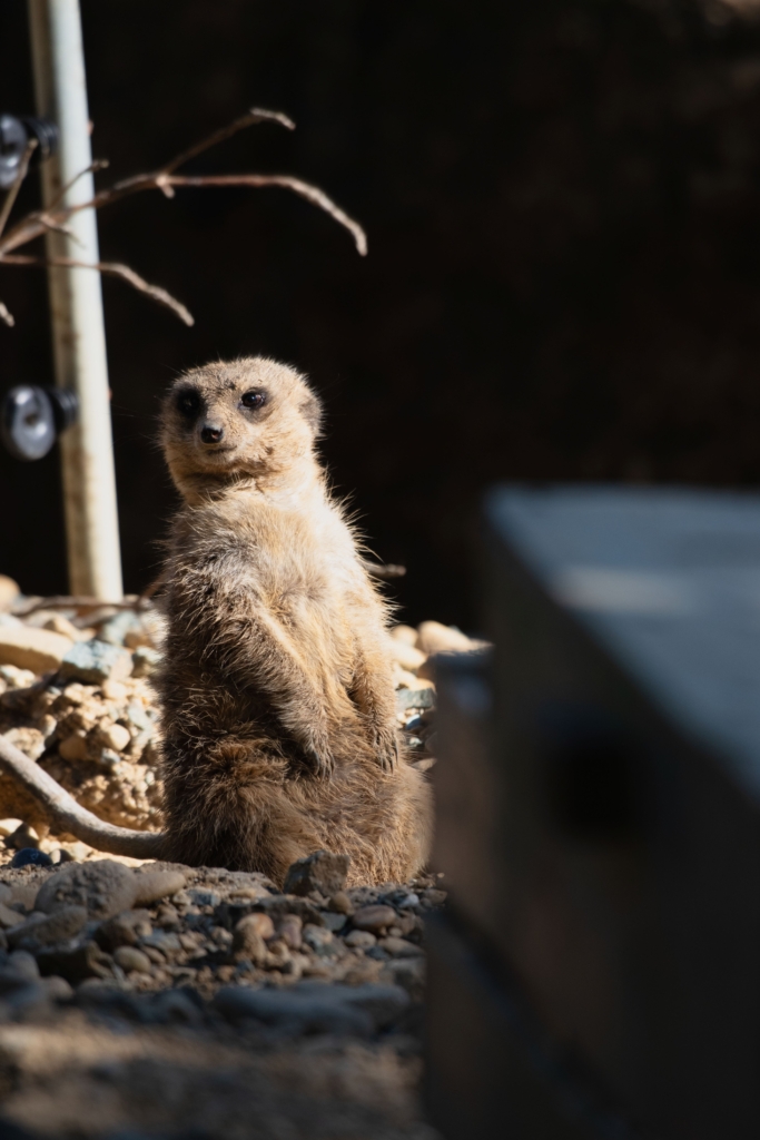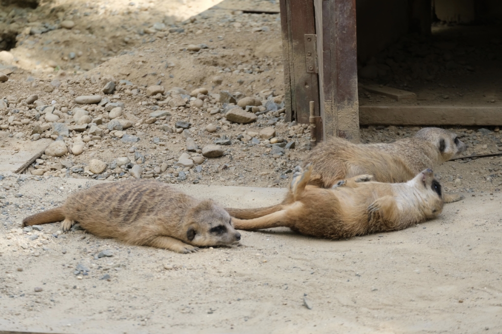 思い思いに休むミーアキャット達。背中の模様も相まって、まるで焼き目をつけている料理工程のように見えた写真です。
