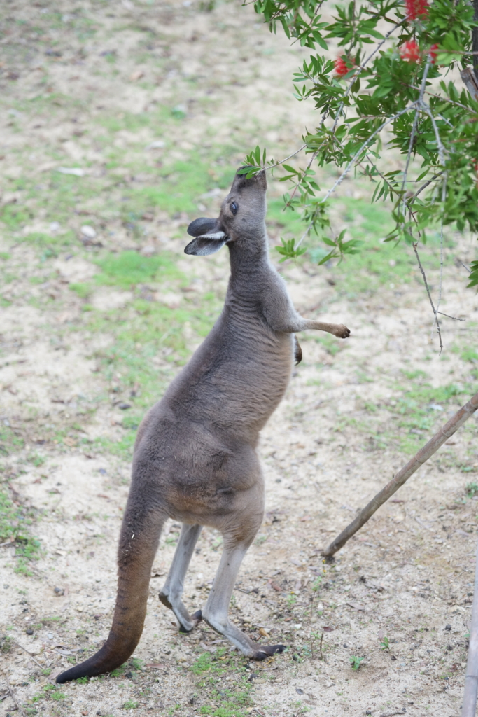 カンガルー舎に植樹されたブラシの木 綺麗な赤い花が咲いても、美味しい葉っぱが好きだよね、うん。